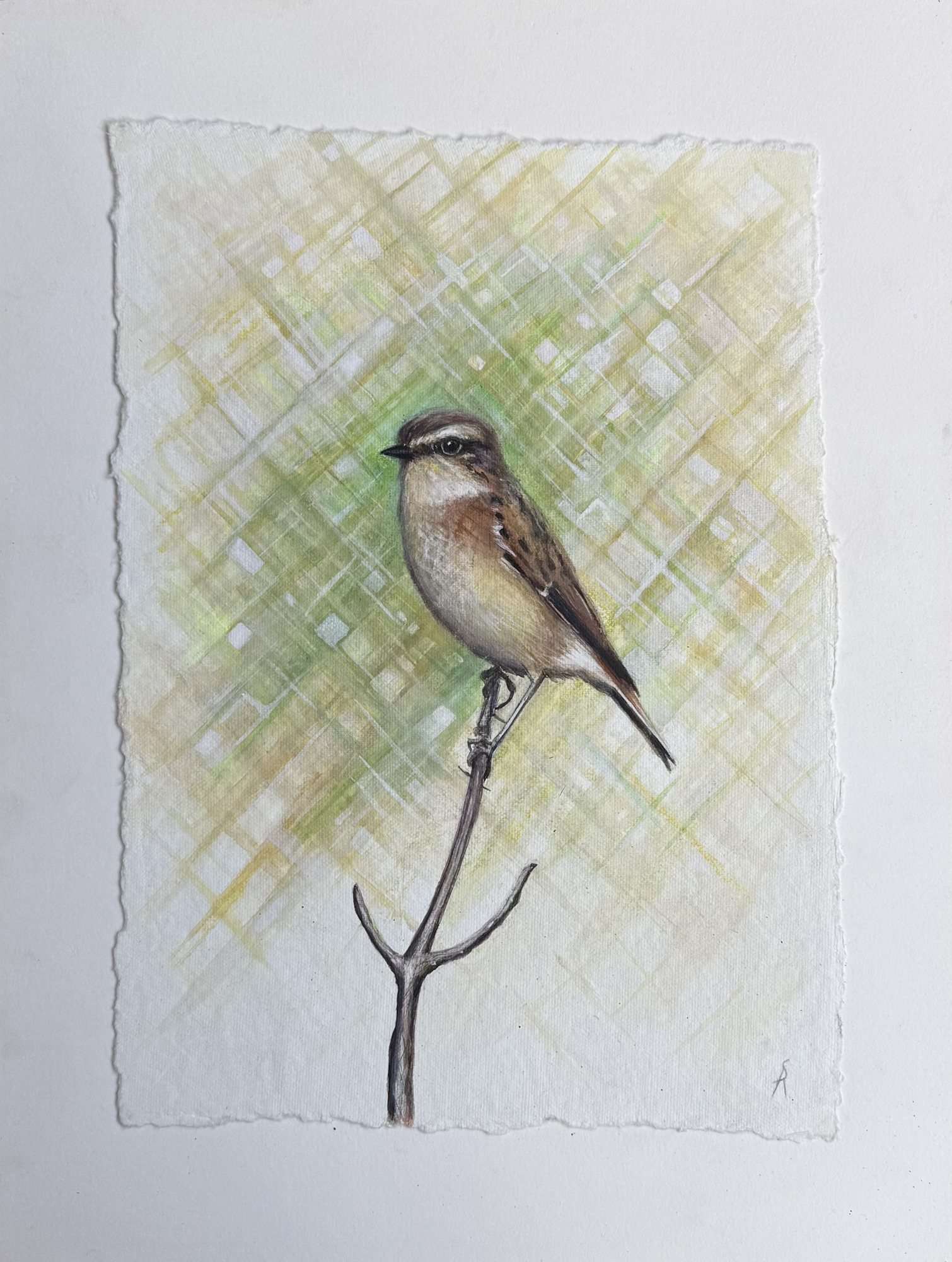 Stejnegers roodborsttapuit, mixed media op papier, 41 x 31 cm.